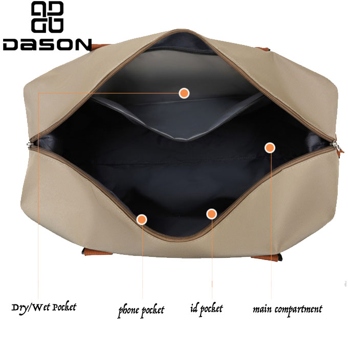 हमारे ट्रैवल डफ़ल बैग डिज़ाइन का मुख्य कम्पार्टमेंट एक सूखी गीली जेब के साथ है जो आपको कपड़े या तौलिया जैसी सूखी/गीली वस्तुओं को अलग करने में मदद करता है।